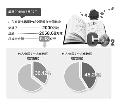 近兩年來,廣東通過多項(xiàng)舉措活躍市場交易,截至2015年7月27日,廣東省碳市場累計(jì)成交配額在全國首次突破了2000萬噸,達(dá)到2058.68萬噸,總成交金額9.18億元,分別約占全國7個(gè)試點(diǎn)地區(qū)成交量的36.12%和成交額的45.28%。