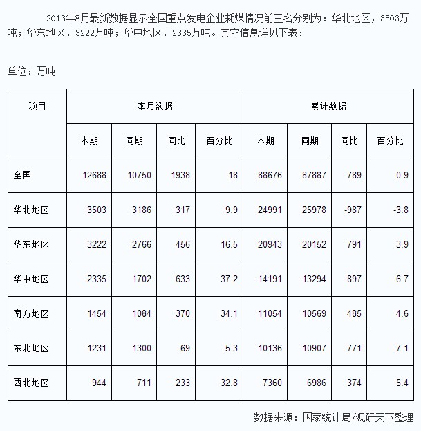 2013年8月中國(guó)重點(diǎn)發(fā)電企業(yè)耗煤情況