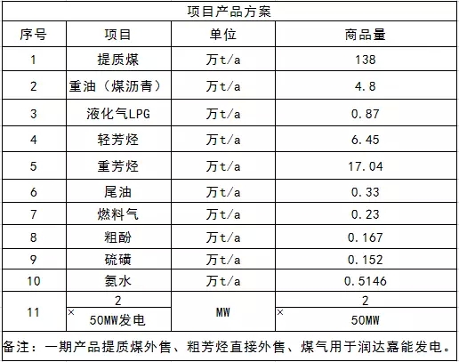 二期:110萬(wàn)t/a小粒煤提質(zhì)裝置及配套荒煤氣凈化裝置、90萬(wàn)t/a粉煤提質(zhì)裝置及配套荒煤氣凈化裝置;30萬(wàn)噸/年粗芳烴精制加工裝置;4.8萬(wàn)噸/年瀝青成型裝置;10.465萬(wàn)標(biāo)方/小時(shí)荒煤氣制氫裝置、尾氣綜合利用2 50MW發(fā)電項(xiàng)目。
