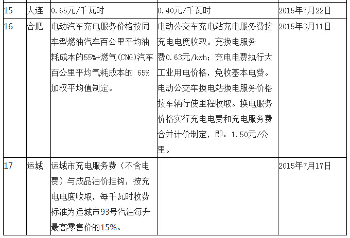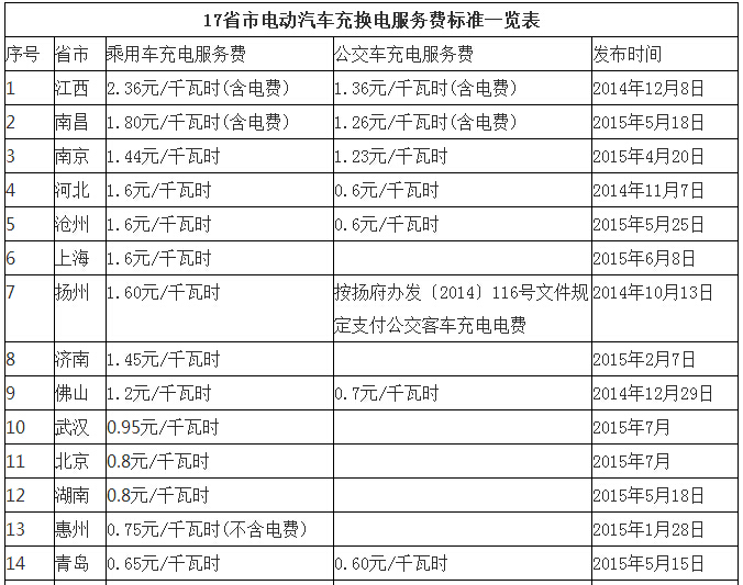 核心提示:近日,大連物價局明確,電動汽車充換電服務(wù)費標(biāo)準(zhǔn)為每千瓦時不超過0.65元。至此,全國已有17省市明確電動汽車充電服務(wù)費標(biāo)準(zhǔn)。