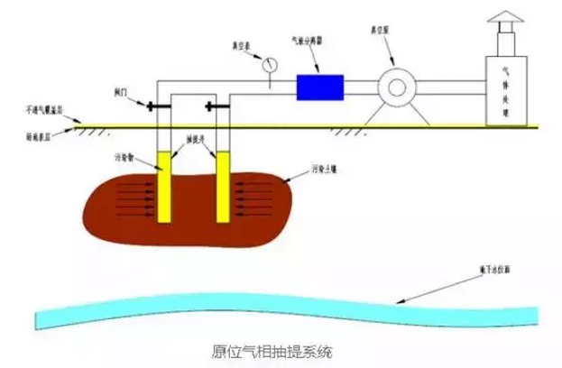 SVE系統(tǒng)要求在包氣帶中設(shè)立抽氣井(井群),使用真空泵在地表抽取包氣帶中的空氣,抽出的氣體要經(jīng)過除水汽和碳吸附后排入大氣、或根據(jù)污染物的不同,采用相應(yīng)的氣體處理技術(shù)。