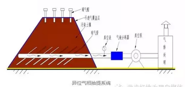 基本原理是利用真空泵抽提產(chǎn)生負壓,空氣流經(jīng)污染區(qū)域時,解吸并夾帶土壤空隙中的揮發(fā)性和半揮發(fā)性有機污染物,由氣流將其帶走,經(jīng)抽提井收集后最終處理,達到凈化包氣帶土壤的目的。有時在抽提的同時,可以設(shè)置注氣井,人工向土壤中通入空氣。