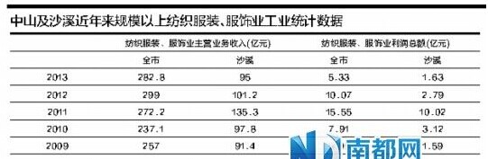 根據(jù)中山市統(tǒng)計局的數(shù)據(jù),2013年,全市規(guī)模以上紡織服裝、服飾業(yè)工業(yè)主營業(yè)務(wù)收入約282.8億元,同比下滑2.2%,利潤總額約5.33億元,同比下滑30.4%,溪規(guī)模以上紡織服裝、服飾業(yè)工業(yè)主營業(yè)務(wù)收入約95億元,同比增長0.6%,總額約1.63億元,同比下滑41.2%。