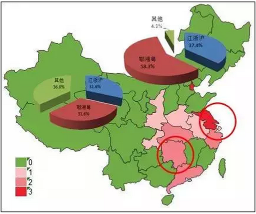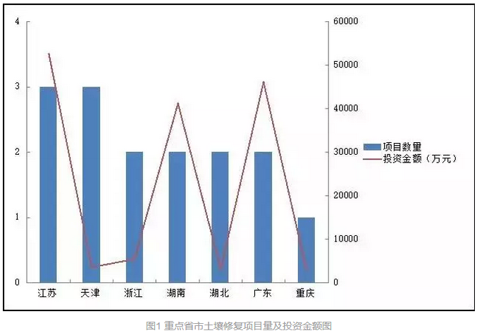 2015年上半年全國土壤修復(fù)類項(xiàng)目主要分布在11個(gè)省直轄市地區(qū),且主要集中在江浙滬、鄂湘粵地區(qū)。兩地區(qū)項(xiàng)目數(shù)量均占比31.6%,總計(jì)占比63.2%;投資金額分別占比37.4%和58.3%,總計(jì)占比達(dá)95.7%??梢钥吹浇銣⒍跸婊浫耘f是土壤修復(fù)的主力市場(圖2)。