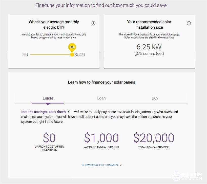 你只要在谷歌提供的工具中輸入自家地址和每月的電費(fèi)等數(shù)據(jù),它便可以為你推薦合適的太陽(yáng)能電池尺寸,并計(jì)算具體的購(gòu)買或租用成本。