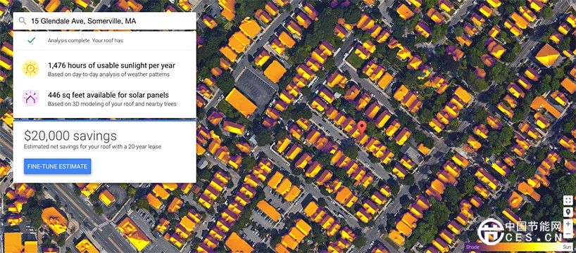 如果你也希望安裝太陽(yáng)能電池板,那么你就要注意觀察一下自家屋頂全年的日光照射強(qiáng)度,以及如果使用太陽(yáng)能電池板一年可以節(jié)省多少電費(fèi)開支。然后你只要在谷歌提供的工具中輸入自家地址和每月的電費(fèi)等數(shù)據(jù),它便可以為你推薦合適的太陽(yáng)能電池尺寸,并計(jì)算具體的購(gòu)買或租用成本。并且會(huì)列出當(dāng)?shù)靥?yáng)能電池板供應(yīng)商的推薦列表。谷歌的工具在計(jì)算日光照射強(qiáng)度時(shí)參考了高分辨率航空測(cè)繪地圖和當(dāng)?shù)靥鞖獾纫蛩亍D壳?,該?jì)劃僅支持居住在舊金山灣區(qū)、加州弗雷斯諾市和馬薩諸塞州波士頓周邊地區(qū)的消費(fèi)者,但是谷歌表示今后將向全世界各大城市繼續(xù)擴(kuò)大這款工具的支持范圍。
