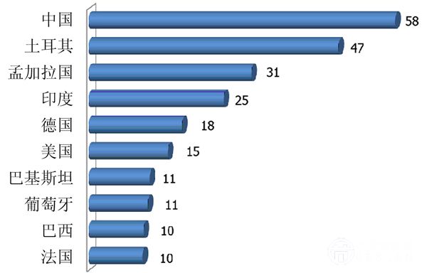 2015年第1季度意大利紡機(jī)對(duì)主要國(guó)家出口額(百萬(wàn)歐元)