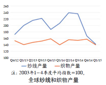 2015年1季度,全球織物產(chǎn)量的環(huán)比下降11%。其中,亞洲和歐洲分別下降了12%和5%。全球織物產(chǎn)量同比持平。其中亞洲的產(chǎn)量攀升了1.5%,歐洲的產(chǎn)量則下降了7.8%。