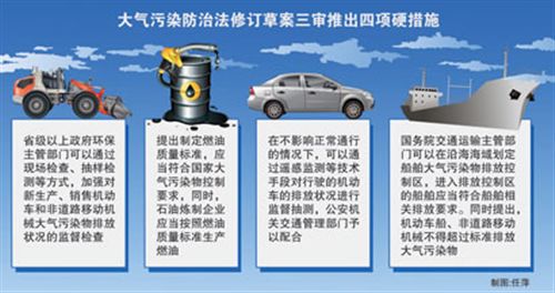 提高燃油質(zhì)量標(biāo)準(zhǔn),明確環(huán)保部門可到車廠進(jìn)行現(xiàn)場檢查、抽樣檢測,增加遙感監(jiān)測手段對行駛的機(jī)動車進(jìn)行監(jiān)督抽測,嚴(yán)控船舶大氣污染排放……大氣污染防治法修訂草案三審稿中的這些硬措施,有望成為治理大氣污染的四項(xiàng)新“法寶”。