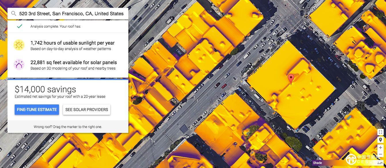 谷歌“屋頂陽光普照”項(xiàng)目的評(píng)估素材會(huì)用到和谷歌地圖相同分辨率的航空照片來繪制地球,為你的屋頂3D建模。會(huì)使用計(jì)算機(jī)深度學(xué)習(xí),可以扣除覆蓋在屋頂上的陰影面積。借助谷歌地圖快速更新的特質(zhì),這部分?jǐn)?shù)據(jù)可以來自不同時(shí)段。地圖上可以看到長出或移走的樹木造成遮擋變化,這部分因素也會(huì)被加入算法。詳細(xì)的電費(fèi)節(jié)約情況需要戶主提供以往的家庭用電參考,如果這項(xiàng)數(shù)據(jù)空缺,系統(tǒng)就會(huì)默認(rèn)根據(jù)所在地區(qū)的平均用電量做估測。