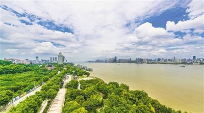 藍(lán)天白云映襯下的武漢江灘 王箏攝