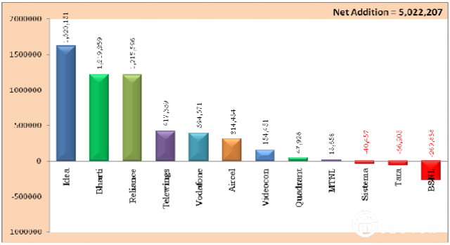 印度電信管理局的數(shù)據(jù)顯示,GSM移動(dòng)服務(wù)提供商Idea Cellular 在2015年6月增加1620151 移動(dòng)用戶,印度最大運(yùn)營(yíng)商Bharti Airtel 增加1219259用戶,Reliance Comm增加1215596,挪威電信Telenor在印度的子公司Unicor增加418339,Vodafone 印度分公司增加 394571,Aircel增加314454 ,Videocon 增加154451移動(dòng)用戶。