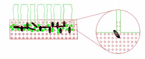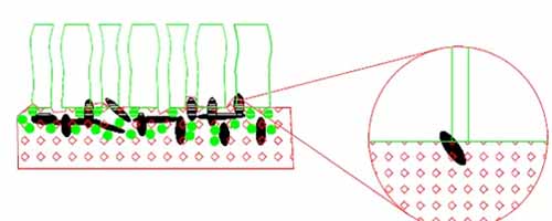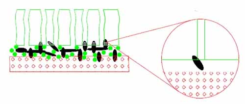 電化學(xué)傳感器溫度范圍也比較寬,一般能夠長(zhǎng)期使用的范圍是15%RH-85%RH。對(duì)EC傳感器最有利的濕度是20℃時(shí)候的60%RH,此時(shí)的傳感器內(nèi)部電極表面如上圖,黑色的催化劑一半在電解液里,一半在電解液外,可以和氣體接觸。