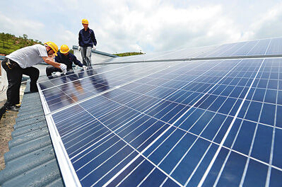 技術(shù)人員在贛州市于都縣羅坳鎮(zhèn)大橋移民新村安裝太陽(yáng)能電池板組件。