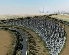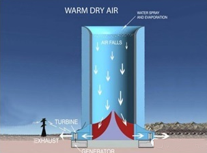 美國的太陽風(fēng)塔能源公司申請了一個專利,利用太陽熱能產(chǎn)生風(fēng),通過風(fēng)來發(fā)電。該裝置是建造一個摩天高塔,在頂部噴射霧狀水,水霧化蒸發(fā)吸收熱量,降低流進(jìn)空氣的溫度,同時增加了空氣密度,是空氣順?biāo)布铀傧蛳铝鲃?,到達(dá)風(fēng)塔底部時,風(fēng)速達(dá)到22米/秒??諝獾竭_(dá)底部后被導(dǎo)向風(fēng)電機(jī),進(jìn)行發(fā)電。