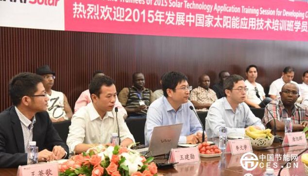 座談會上,樂葉光伏海外銷售經理王建勛介紹了公司的基本情況以及未來的海外發(fā)展計劃,多次強調了公司的單晶技術路線,表達了單晶必將引領光伏未來的信心。甘肅自然能源研究所副所長李世民順勢也提到位于蘭州的最早的光伏電站,采用單晶組件,運行時間超過30年,至今仍然正常運轉,體現了極好的可靠性。隨后外籍學員也踴躍向樂葉咨詢技術和將來的合作方式等問題,氣氛熱烈。