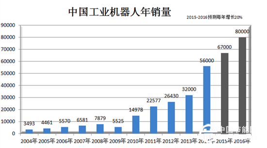 統(tǒng)計顯示,近年來中國工業(yè)機器人銷售處于快速增長階段,2013年中國已成為全球第一大工業(yè)機器人市場。據(jù)國際機器人協(xié)會(IFR)統(tǒng)計,2014年全球工業(yè)機器人銷量增長27%,中國增勢最為迅猛,達54%,年銷售5.7萬臺左右。