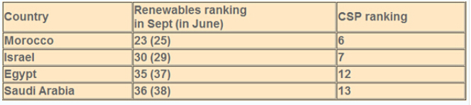 下表列出了中東北非地區(qū)上榜國家的可再生能源市場及光熱發(fā)電市場的詳細(xì)排名: