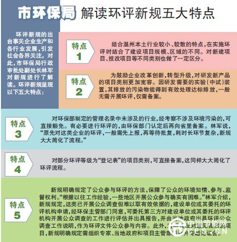 據(jù)介紹,此次改革內(nèi)容適用于溫州全市范圍,根據(jù)《中華人民共和國環(huán)境影響評價法》《浙江省建設(shè)項目環(huán)境保護管理辦法》制定,旨在深化生態(tài)文明體制改革,更好地實施建設(shè)項目環(huán)評分類管理工作。此前我市環(huán)評標(biāo)準(zhǔn)主要參照環(huán)保部及省環(huán)保廳相關(guān)規(guī)定執(zhí)行,在市本級僅針對個別行業(yè)出臺過相應(yīng)標(biāo)準(zhǔn)。此次環(huán)評審批制度改革,使溫州建設(shè)項目環(huán)評有了總體依據(jù),更符合本地實際情況。