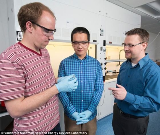 安德魯-威斯多弗(左)、約翰-迪恩和卡里-賓特正在欣賞他們的超級電容器。該科研組表示,他們已經(jīng)首次成功打造出這項(xiàng)技術(shù)的功能健全的原型機(jī)。