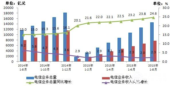 圖1 2014-2015年8月電信業(yè)務(wù)總量與業(yè)務(wù)收入發(fā)展情況