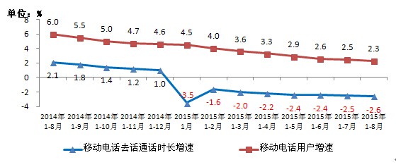 圖5 2014-2015年8月移動(dòng)電話通話量和移動(dòng)電話用戶同比增長(zhǎng)比較