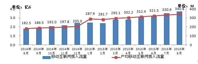 圖7 2014-2015年8月移動(dòng)互聯(lián)網(wǎng)接入流量和戶均流量比較