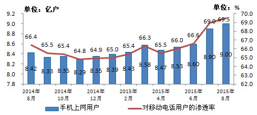 圖4 2014-2015年8月手機(jī)上網(wǎng)用戶和對(duì)移動(dòng)電話用戶滲透率情況