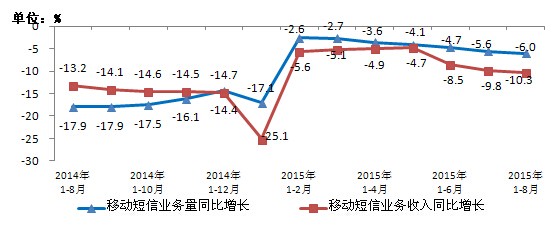 圖6 2014-2015年8月移動(dòng)短信業(yè)務(wù)量和移動(dòng)短信收入同比增長(zhǎng)情況