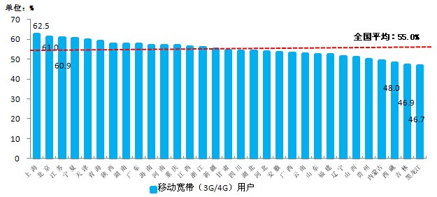 8月,東、中、西部地區(qū)移動(dòng)寬帶(3G/4G)用戶分別比上年末凈增6864.7、3256.6、2974.4萬戶,東部地區(qū)的凈增用戶超過中西部地區(qū)凈增之和,但移動(dòng)寬帶(3G/4G)用戶滲透率相差較小,東、中、西部地區(qū)移動(dòng)寬帶(3G/4G)用戶滲透率分別達(dá)56.3%、53.6%和53.9%。各省間移動(dòng)寬帶(3G/4G)用戶占比差異依然較大,占比高于50%的省份達(dá)26個(gè),其中上海、北京、江蘇、寧夏和天津分別居全國(guó)前五位,占比均超過59%。吉林和黑龍江兩省占比最低,分別只有46.9%和46.7%。