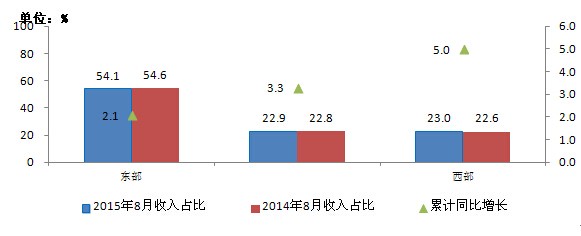 圖10 2015年8月東、中、西部電信主營(yíng)業(yè)務(wù)收入同期比較
