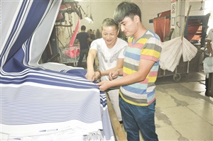 圖為吳峰(右)在車間與工人研究沙灘褲印花面料。