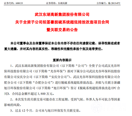 武漢東湖高新集團(tuán)股份有限公司關(guān)于全資子公司擬簽署脫硫系統(tǒng)超低排放改造項(xiàng)目合同暨關(guān)聯(lián)交易的公告