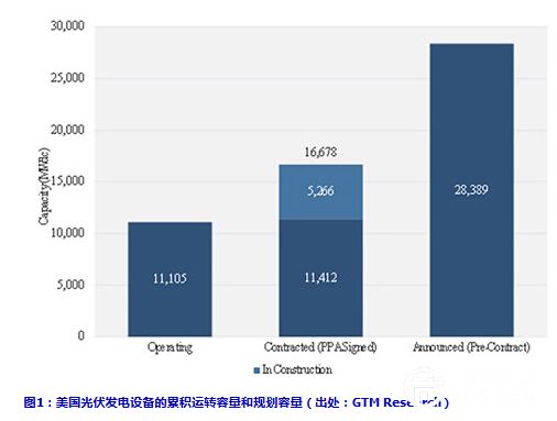 SEIA與GTM Research的最新報告顯示,此前累積建設了11.1GW以上的發(fā)電業(yè)務用百萬光伏電站。目前有超過16.6GW的百萬光伏電站業(yè)務處于簽完購電協(xié)議的階段(待建項目),其中5.2GW正在建設中。并且,還有28.3GW以上的百萬光伏電站正在規(guī)劃中(即發(fā)布過建設計劃,尚未簽訂購電協(xié)議)。就是說,預定建設的百萬光伏電站達到了45GW。