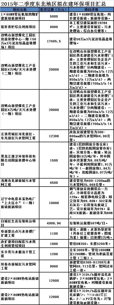 2015年二季度東北地區(qū)擬在建環(huán)保項(xiàng)目匯總,涉及污水處理、固廢處理等。詳情如下表: