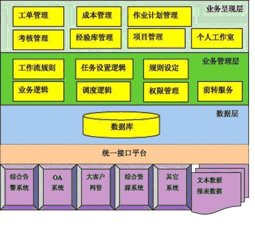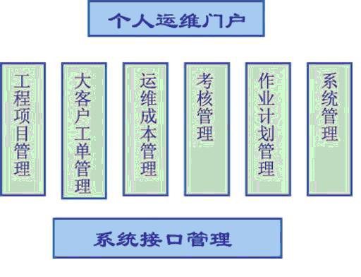 電子運(yùn)維管理系統(tǒng)由個(gè)人運(yùn)維門戶、作業(yè)計(jì)劃管理、考核管理、大客戶工單管理、工程管理、運(yùn)維成本管理、綜合接口平臺(tái)等模塊組成。