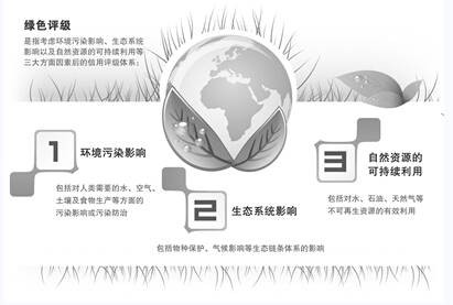 綠色評(píng)級(jí)是指考慮環(huán)境污染影響、生態(tài)系統(tǒng)影響以及自然資源的可持續(xù)利用等三大方面因素后的信用評(píng)級(jí)體系:一是環(huán)境污染影響,包括對(duì)人類需要的水、空氣、土壤及食物生產(chǎn)等方面的污染影響或污染防治;二是生態(tài)系統(tǒng)影響,包括物種保護(hù)、氣候影響等生態(tài)鏈條體系的影響。例如建設(shè)水庫(kù)、修建鐵路公路可能阻斷生物遷徙,碳排放可能引起氣候變化導(dǎo)致自然環(huán)境改變而造成生命物種滅絕等;三是自然資源的可持續(xù)利用,包括對(duì)水、石油、天然氣等不可再生資源的有效利用。