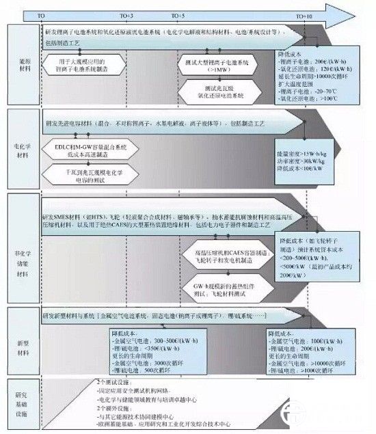 《低碳能源技術(shù)材料路線圖》指出,蓄電是一項重要的技術(shù),可以提高歐洲電力系統(tǒng)的可管理性和靈活性;目前,大多數(shù)儲能技術(shù)過于昂貴,在系統(tǒng)規(guī)模的廣泛部署和集成方面技術(shù)性能不足;材料往往限制性能提高,而這也是安全和可靠電網(wǎng)中存儲技術(shù)經(jīng)濟性、有效性和可靠性選擇方面的決定因素;將存儲技術(shù)帶入商業(yè)成熟階段,并加快過渡到大規(guī)模商業(yè)化是一項優(yōu)先任務(wù)。