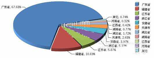 2015年1~6月,全國(guó)發(fā)光二極管(LED)累計(jì)產(chǎn)量1774.54億只,同比增長(zhǎng)37.33%。比重主要集中在廣東省、福建省、江蘇省、浙江省、安 徽省等地區(qū)。其中:廣東省完成累計(jì)產(chǎn)量1201.05萬萬只(占67.68%),同比增長(zhǎng)58%。