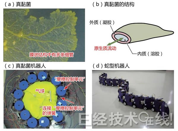 東北大學(xué)試制了真黏菌型機(jī)器人(a)。真黏菌由溶膠狀的“內(nèi)質(zhì)”和凝膠狀的“外質(zhì)”組成(b)。裝滿(mǎn)水的氣球充當(dāng)內(nèi)質(zhì),配置在氣球周?chē)亩鄠€(gè)“摩擦控制單元”通過(guò)彈簧連接成環(huán)狀,作為外質(zhì)(c)。真黏菌的自律控制規(guī)則運(yùn)用于蛇型機(jī)器人,成功對(duì)其進(jìn)行了驅(qū)動(dòng)(d)。(圖:《日經(jīng)電子》根據(jù)東北大學(xué)的資料制作)