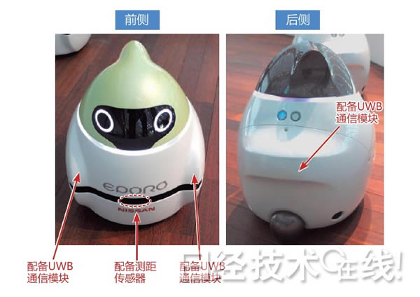 日產(chǎn)汽車(chē)結(jié)合魚(yú)群的活動(dòng),開(kāi)發(fā)出了能夠避免與周?chē)臋C(jī)器人和障礙物碰撞的機(jī)器人車(chē)“EPORO”。檢測(cè)周?chē)鷻C(jī)器人的距離和方向使用兩種傳感器。分別是使用紅外激光的測(cè)距傳感器和UWB通信模塊。EPORO利用UWB通信模塊與周?chē)臋C(jī)器人進(jìn)行通信,根據(jù)通信耗費(fèi)的時(shí)間推測(cè)距離。
