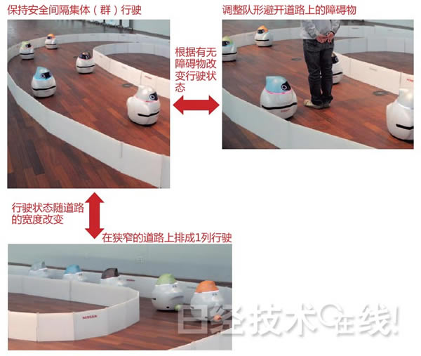 日產(chǎn)汽車(chē)的機(jī)器人車(chē)“EPORO”能夠根據(jù)情況改變集體行駛的狀態(tài)。舉例來(lái)說(shuō),在寬敞的道路上,EPORO保持安全間隔,分散行駛,而在狹窄的道路上,EPORO則排成1列行駛。前方出現(xiàn)障礙物的時(shí)候,還會(huì)改變行駛的隊(duì)形,避開(kāi)障礙物。