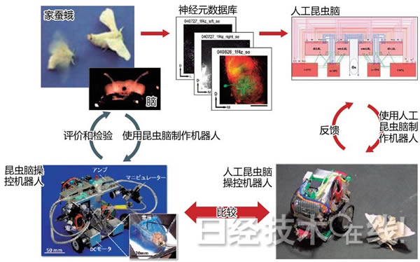 通過(guò)解明家蠶蛾朝信息素發(fā)生源的方向移動(dòng)的腦結(jié)構(gòu),制造人工腦,用來(lái)驅(qū)動(dòng)機(jī)器人。(圖:《日經(jīng)電子》根據(jù)東京大學(xué)的資料制作)