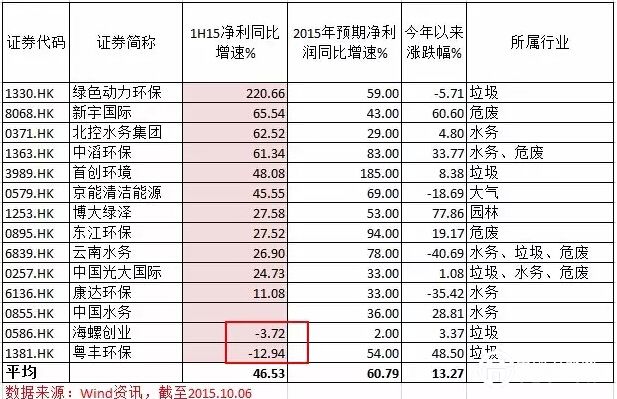 我在此列舉了主要的14家港股環(huán)保公司,以最新的2015年中報里的凈利潤增速排序,14家公司中僅有兩家業(yè)績倒退,并且這兩家公司業(yè)績倒退完全不具代表性(其中粵豐環(huán)保是受到去年一次性增值稅退稅以及一間工廠技改停用導(dǎo)致,而非實際運營業(yè)績倒退;而海螺創(chuàng)業(yè)的環(huán)保業(yè)務(wù)還處于初創(chuàng)期,業(yè)績主要受水泥行業(yè)負面影響)。14家環(huán)保公司中有10家在今年上半年的業(yè)績增速超過24%;而整個行業(yè)的平均增速約46%,今年全年預(yù)期的業(yè)績增速更是高達60%以上。