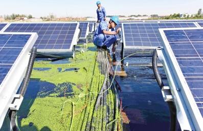 10月10日,電力工人在河北省臨西縣靈溪湖水上光伏發(fā)電場工作。2015年以來,河北省通過市場機制在片區(qū)縣和貧困縣因地制宜開展光伏農業(yè)扶貧,利用貧困地區(qū)荒山荒坡、農業(yè)大棚或設施農業(yè)等建設光伏電站,使貧困人口直接增加收入。據了解,今年河北省的光伏電站建設總體規(guī)模為120萬千瓦,其中有30萬千瓦專門用于光伏扶貧試點縣的配套光伏電站建設。