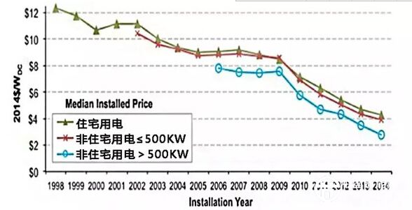 任何技術(shù)只要應(yīng)用成本過于昂貴,那么它就無法推廣。隨著太陽能性價(jià)比越來越高(下圖),太陽能的產(chǎn)能也大為提高。在2004年,全球共有2.6GW太陽能光伏的發(fā)電量,現(xiàn)在這一數(shù)字已經(jīng)達(dá)到了200GW。