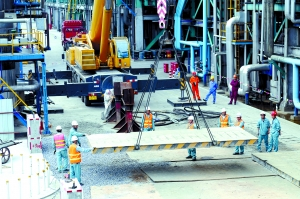 揚(yáng)子乙烯節(jié)能改造項(xiàng)目是揚(yáng)子石化的重點(diǎn)改造項(xiàng)目,它是以中國(guó)石化自有專(zhuān)利技術(shù)和研究成果為基礎(chǔ),分別對(duì)乙烯裝置的裂解系統(tǒng)和分離系統(tǒng)進(jìn)行節(jié)能降耗改造,該工程已于今年4月完工。圖為揚(yáng)子石化工作人員正在對(duì)乙烯裝置裂解系統(tǒng)進(jìn)行技術(shù)改造。 (本報(bào)記者 陶炎 攝)