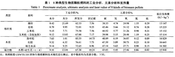 本試驗(yàn)所用生物質(zhì)顆粒燃料均于2009年7月取自北京市大興區(qū)某生物質(zhì)顆粒燃料生產(chǎn)廠,由農(nóng)業(yè)部規(guī)劃設(shè)計(jì)研究院研制的485型生物質(zhì)顆粒燃料成型機(jī)壓制而成。試驗(yàn)選取了8種典型的生物質(zhì)顆粒燃料,包括棉稈、麥秸、玉米秸、玉米秸(含添加劑)4種秸稈類顆粒燃料;落葉松、紅松、混合木質(zhì)(榆樹、柳樹、楊樹、桃樹和紅松的混合物)3種木質(zhì)顆粒燃料;以及1種木質(zhì)與秸稈類的混合生物質(zhì)顆粒燃料(木屑與花生殼混合,質(zhì)量比為1:4)。所有顆粒燃料均壓縮加工為圓柱型,直徑8min,長度10~30rnn],顆粒密度約1.2g/c。8種典型生物質(zhì)顆粒燃料的特性見表1。
