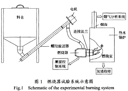 本試驗(yàn)所用的裝置如圖1所示,整個(gè)系統(tǒng)由料倉、螺旋輸送器、燃燒器、熱水鍋爐、煙氣分析系統(tǒng)和測量控制系統(tǒng)等組成。其中,燃燒系統(tǒng)選用從瑞典引進(jìn)的PelleX生物質(zhì)顆粒燃料自動(dòng)燃燒器,熱輸出為10~25kw;燃燒效率約為90%;點(diǎn)火功率消耗約為400w;運(yùn)行時(shí)功率消耗約為40w。該燃燒器的喂料方式為上進(jìn)料式,具有燃燒器與料倉分離、回火危險(xiǎn)小、可根據(jù)功率要求保證精確定量進(jìn)料等優(yōu)點(diǎn)。