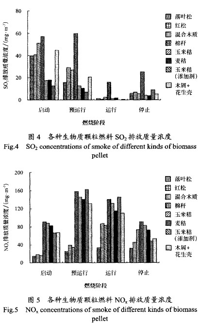 不同生物質(zhì)顆粒燃料的煙氣中SO2、NO排放質(zhì)量濃度如圖4、圖5所示。燃燒器的啟動(dòng)、預(yù)運(yùn)行以及停止階段,SO2排放濃度相對(duì)較高,這是由于不完全燃燒引起的;在運(yùn)行階段,絕大部分生物質(zhì)燃料燃燒時(shí)SO的排放濃度非常低,污染物排放水平較低,基本為零(見圖4),遠(yuǎn)遠(yuǎn)低于GB13271-2001鍋爐大氣污染物排放標(biāo)準(zhǔn)中規(guī)定的900mg/m的指標(biāo)。這主要是由生物質(zhì)中s含量較低所決定的。棉稈則是一個(gè)例外,其SO,排放濃度遠(yuǎn)高于其他生物質(zhì)燃料,S含量與其處于同一數(shù)量級(jí)的其他秸稈類燃料的SO2排放濃度則低得多。這說明生物質(zhì)燃燒時(shí),其SO生成機(jī)理的復(fù)雜性,不僅與s含量有關(guān),而且與燃料種類和設(shè)備等因素有關(guān)。